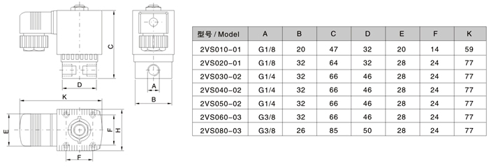 | ■ 产品特点 ◆ 适用于:气、水、油品 ◆ 直动式,启闭迅速 ◆ 可靠性高、寿命长 线圈:热固性塑料包覆 IP65保护制式 ◆ 更换先导头及线圈可作防爆阀用 ■ 举例 ▲ 欲订购接管螺纹为G1/4",标准电压为DC24V,公称通径为3mm,2VS系列电磁阀,其正确的订购码为:2VS030-02-DC24V | ||||||||||||||||||||||||||||||||||||||||||||||||||||